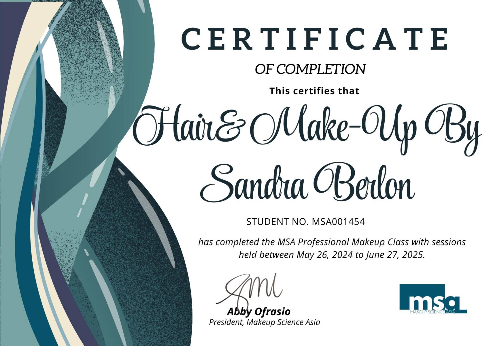 Hi, I’m Sandra Berlon, a passionate and dedicated professional makeup artist. My love for makeup started back in high school, where I first began exploring the art of enhancing beauty. What began as a hobby quickly grew into a true calling, leading me to pursue professional training at Makeup Science Asia Academy, where I honed my skills and deepened my knowledge of the craft.